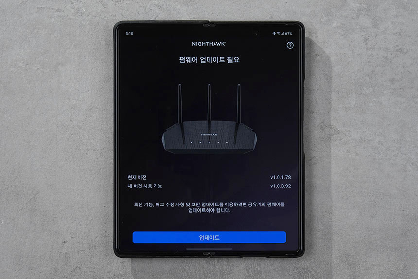 기본적인 세팅이 완료되면 넷기어 RAX10 공유기의 최신 펌웨어를 검색하게 되고 바로 업데이트를 진행할 수 있는 메뉴가 표시됩니다. 그리고 이때 재부팅이 필요해서 스마트폰의 와이파이 연결이 끊어질 수 있습니다.