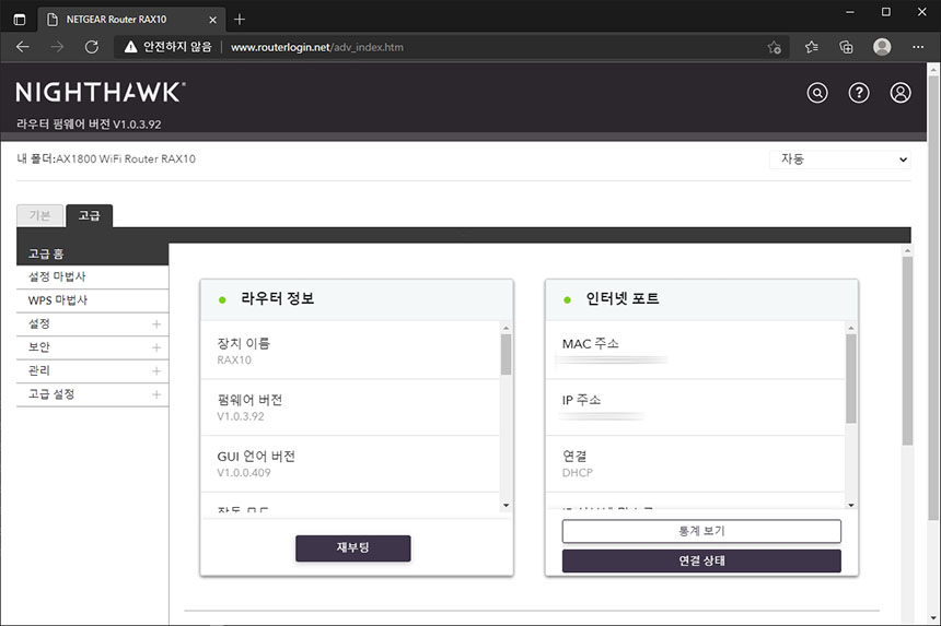 넷기어 RAX10 공유기의 관리자 페이지는 www.routerlogin.net이라는 주소로 접속할 수 있습니다. 우선 기본 탭의 홈 화면에서는 현재 상태를 한 눈에 확인할 수 있도록 구성되어 있습니다.