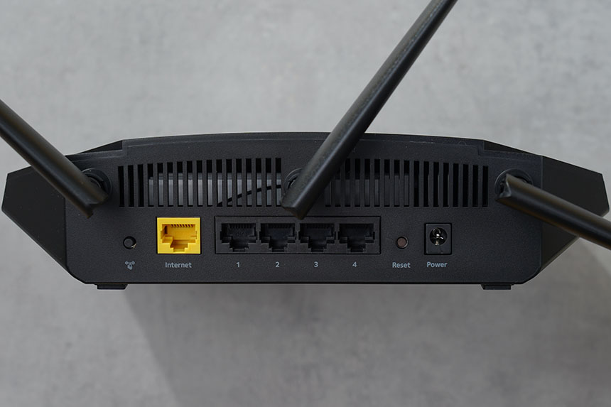 뒤쪽을 살펴보면 기가비트를 지원하는 1개의 WAN과 4개의 LAN 포트가 준비되어 있습니다. 일반적인 구성이라고 할 수 있습니다. 그리고 양옆에 WPS와 리셋 버튼이 배치되어 있습니다.