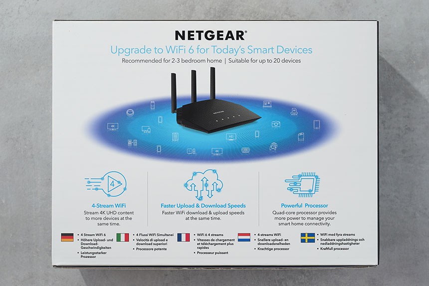 박스의 뒷면을 살펴보면 넷기어 RAX10 공유기의 주요 특징들이 설명되어 있습니다. 우선 2~3개의 침실이 있는 가정에서 사용하기에 적합한 성능을 제공하고 4 스트림 AX 와이파이와 1.5GHz 쿼드코어 프로세서를 탑재했습니다.