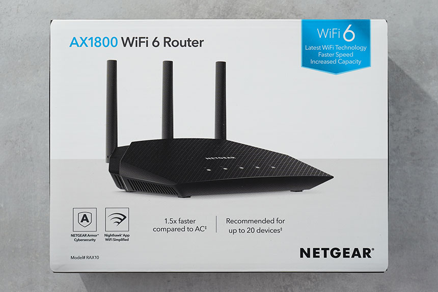 넷기어 RAX10 공유기의 박스는 깔끔한 형태로 제작되었습니다. 그리고 상단에는 와이파이6를 지원하는 공유기라는 문구가 표시되어 있습니다. 참고로 와이파이6는 차세대 표준 규격으로 다중접속 환경에서도 최상의 무선 인터넷 품질을 제공하도록 설계되었습니다.