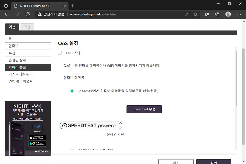 서비스 품질에서는 QoS 기능을 켜고 끌 수 있습니다. 중요도가 높은 데이터를 먼저 처리해주는 기능으로 넷기어 RAX10 공유기에 접속된 장치들의 종류가 많을 때 활용하면 좋을 것 같습니다.