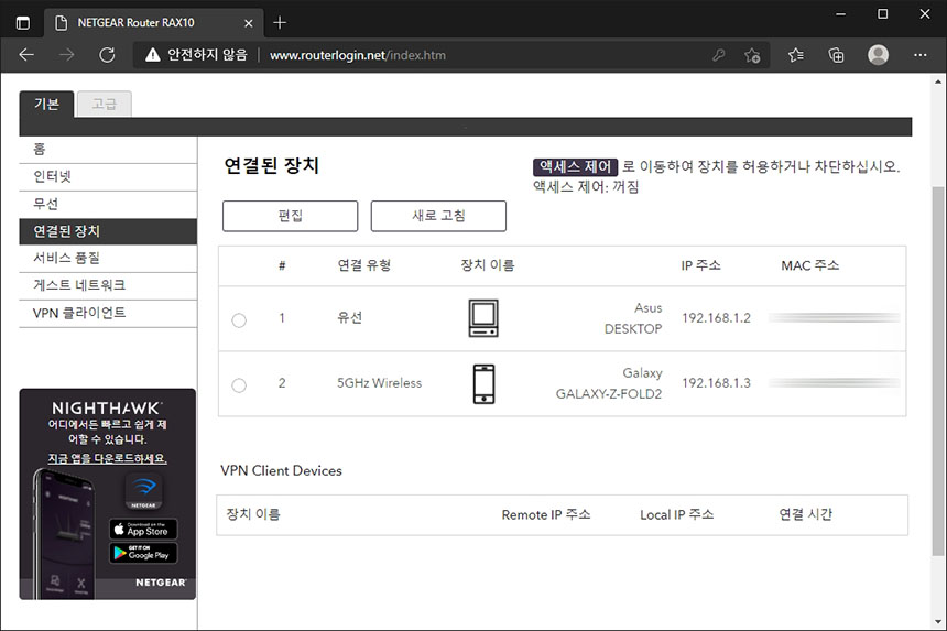 연결된 장치를 살펴보면 넷기어 RAX10 공유기에 접속해 있는 장치들의 연결 유형과 이름 그리고 내부 IP 주소를 확인할 수 있습니다. 액세스 제어 기능과 결합해서 바로 장치를 차단할 수 있다는 점이 편리한 부분입니다.
