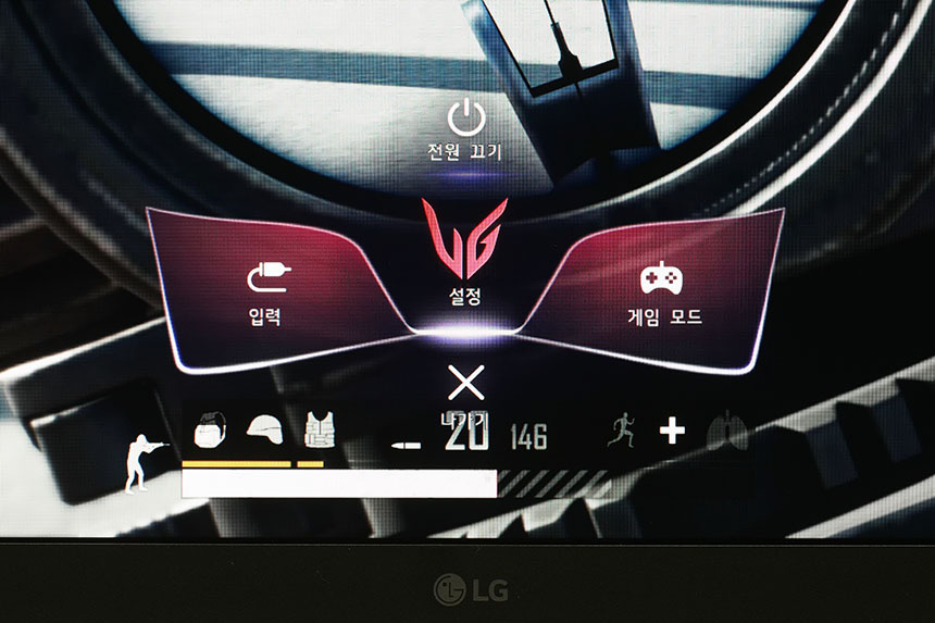 LG 울트라기어 32GP850의 OSD(메뉴화면)도 게이밍 모니터에 걸맞게 그래픽적인 요소가 훨씬 강조된 형태로 업그레이드되었습니다. 우선 버튼을 누르면 입력을 변경하거나 설정으로 진입하고 게임 모드를 변경할 수 있는 메뉴가 표시됩니다.