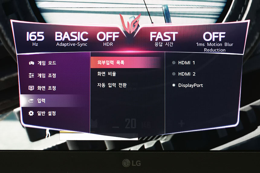 LG 울트라기어 32GP850의 편리한 기능 중의 하나는 자동입력전환 기능을 갖추고 있다는 점입니다. 그래서 모니터에 연결된 단자의 신호가 꺼지면 수동으로 조작할 필요 없이 다른 단자로 전환됩니다.
