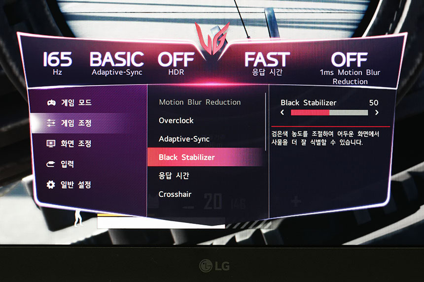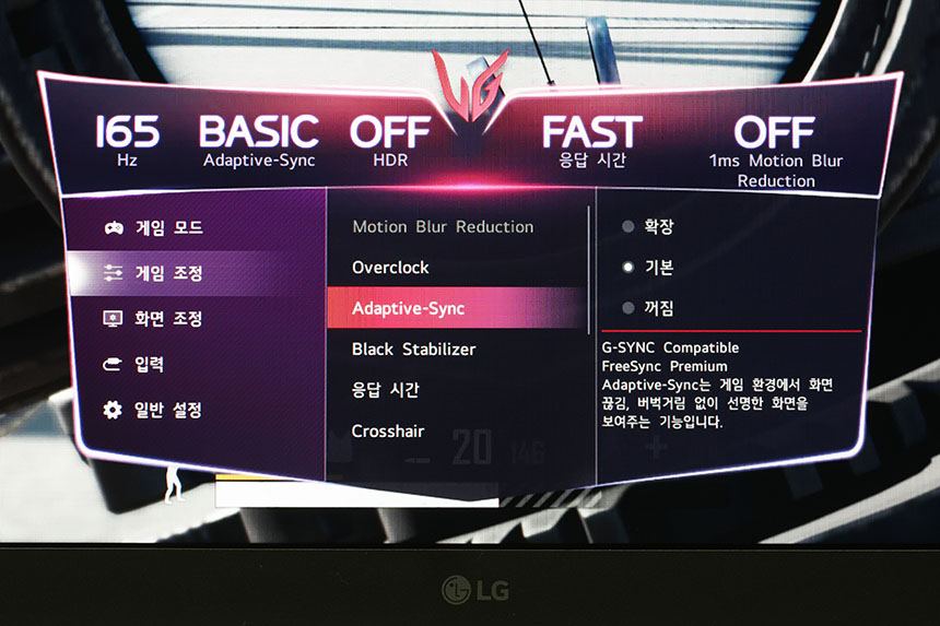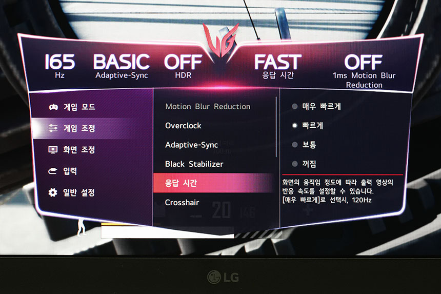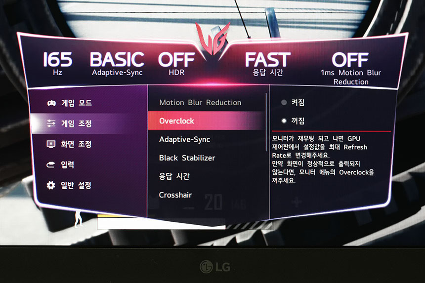 LG 울트라기어 32GP850은 기본 165Hz의 고주사율을 지원합니다. 그리고 오버클럭을 통해서 최대 180Hz까지 주사율을 변경할 수 있습니다. 화면 전환이 빠른 게임을 플레이할 때 설정해주는 것이 좋을 것 같습니다.