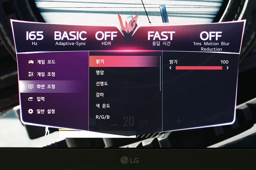화면 조정에서는 밝기나 RGB 값 등을 변경할 수 있습니다. 취향에 따라서 설정하는 것이 좋을 것 같습니다. 참고로 LG 울트라기어 32GP850은 공장 색교정이 적용되어서 출하되기 때문에 상대적으로 정확한 색을 표현해 줍니다.