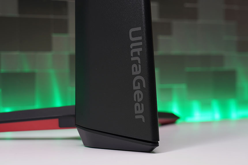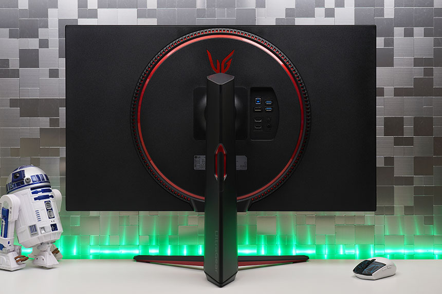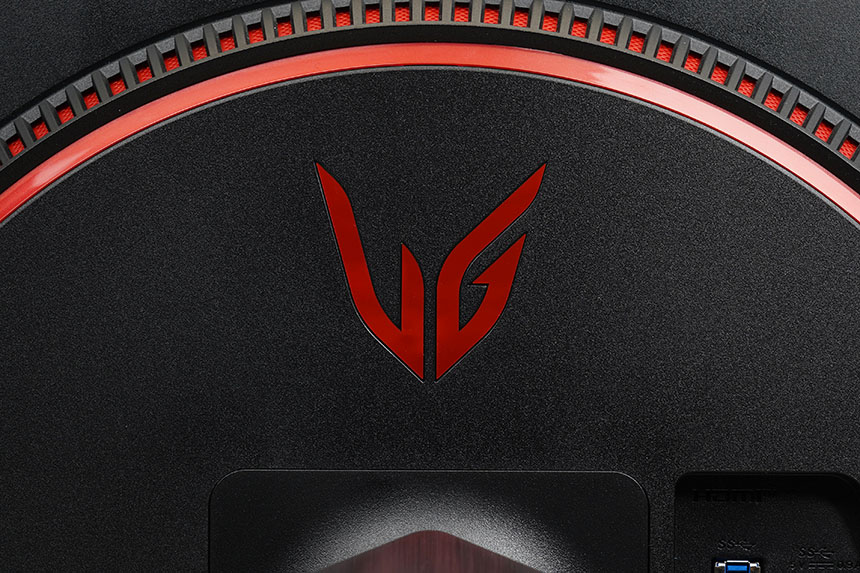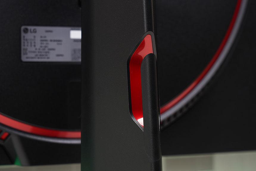 LG 울트라기어 32GP850의 뒷면은 상당히 세련된 형태로 제작되었습니다. 그래서 책상을 벽에 붙이지 않고 방의 중앙에 설치해서 사용하는 분들도 부담 없이 설치할 수 있습니다. 특히 저는 레드 컬러의 원형 테두리가 인상적이었습니다.