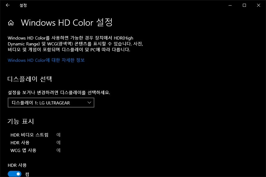 LG 울트라기어 32GP850은 HDR10 기술을 지원합니다. 참고로 윈도우 10 기준으로는 Windows HD Color 설정에서 HDR 사용을 켬으로 변경해주어야 합니다. 플레이하는 게임이나 재생하는 콘텐츠에 따라서 켜고 끄는 것이 좋을 것 같습니다.