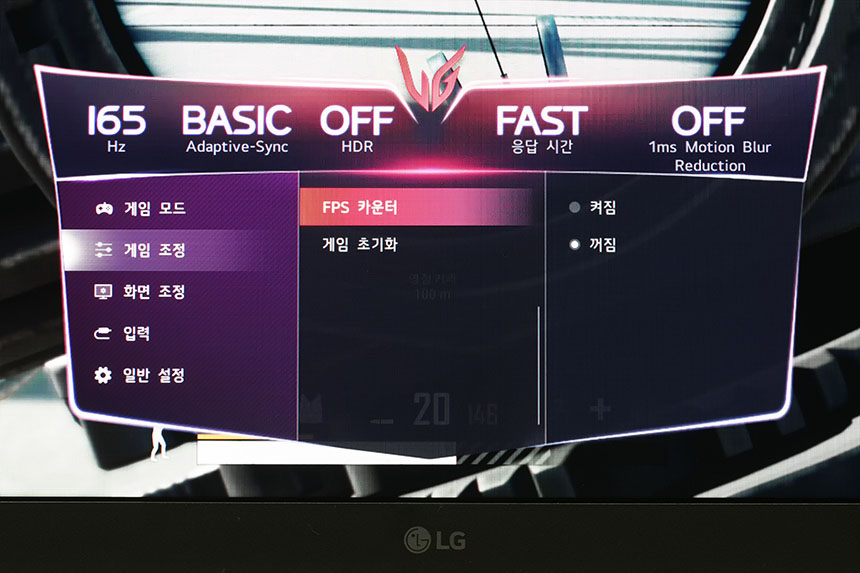 LG 울트라기어 32GP850에는 FPS 카운터라는 기능이 탑재되었습니다. MSI Afterburner와 같은 별도의 소프트웨어를 사용하지 않고도 하드웨어적으로 화면에 현재 프레임을 표시할 수 있습니다. 프레임에 민감한 게임을 플레이할 때 활용하면 좋을 것 같습니다.