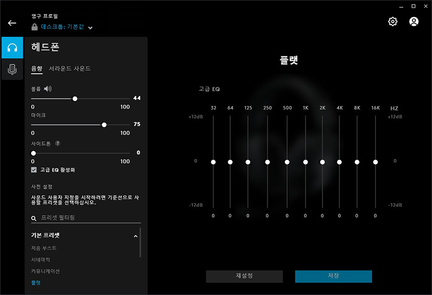 로지텍 G HUB 프로그램의 사용법을 확인해 보면 헤드폰 메뉴에서는 볼륨이나 마이크의 레벨을 변경할 수 있고 특히 고급 EQ 활성화 기능을 켜면 이퀄라이저를 통해서 자신이 원하는 음색을 주파수 별로 찾아갈 수 있습니다. 그 외에도 기본 프리셋을 통해서 저음 부스트나 시네마틱 그리고 커뮤니케이션이나 플랫 등도 바로 적용할 수 있습니다.