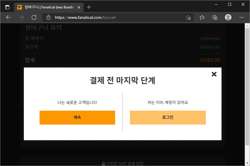 아래의 링크를 이용해서 fanatical에 접속하면 사이트는 한글화되어 있고 중간에 장바구니에 담기라는 문구가 표시된 것을 확인할 수 있습니다. 그리고 기간은 약 2주 정도입니다.