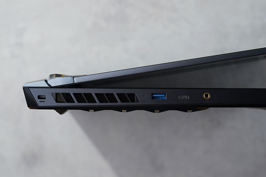 입출력 단자를 살펴보면 왼쪽에는 도난 방지를 위한 켄싱턴락 홀과 USB 3.2 타입 A와 C 포트 그리고 이어폰과 마이크를 같이 사용할 수 있는 오디오 콤보 잭이 배치되어 있습니다.