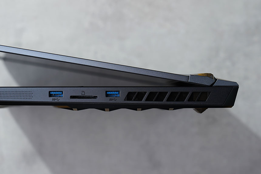 반대쪽 옆면에는 2개의 USB 3.2 타입 A 포트와 SD 카드 리더가 배치되어 있습니다. 디지털카메라로 촬영한 사진이나 동영상을 편리하게 복사할 수 있어서 콘텐츠 크리에이터들이 사용해도 좋을 것 같습니다.