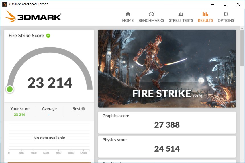 3D 마크를 통해서 성능을 살펴보면 파이어 스트라이크는 23,214점 타임 스파이는 10,295점으로 측정되었습니다. 상당히 뛰어난 수준의 성능을 제공하는 것을 확인할 수 있습니다.