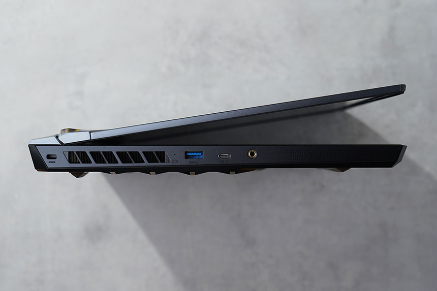 입출력 단자를 살펴보면 왼쪽에는 도난 방지를 위한 켄싱턴락 홀과 USB 3.2 타입 A와 C 포트 그리고 이어폰과 마이크를 같이 사용할 수 있는 오디오 콤보 잭이 배치되어 있습니다.
