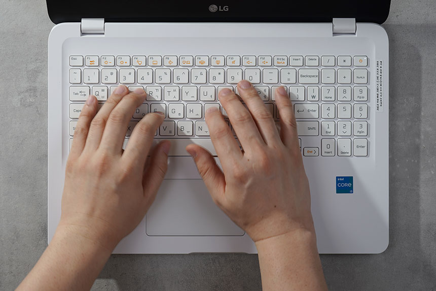 LG전자 2021 울트라PC 15UD50P-GX30K에는 풀 사이즈의 97키 키보드가 탑재되었습니다. 숫자 키패드를 포함한 형태로 제작되어서 문서 작업 용도로도 부족하지 않은 편입니다.