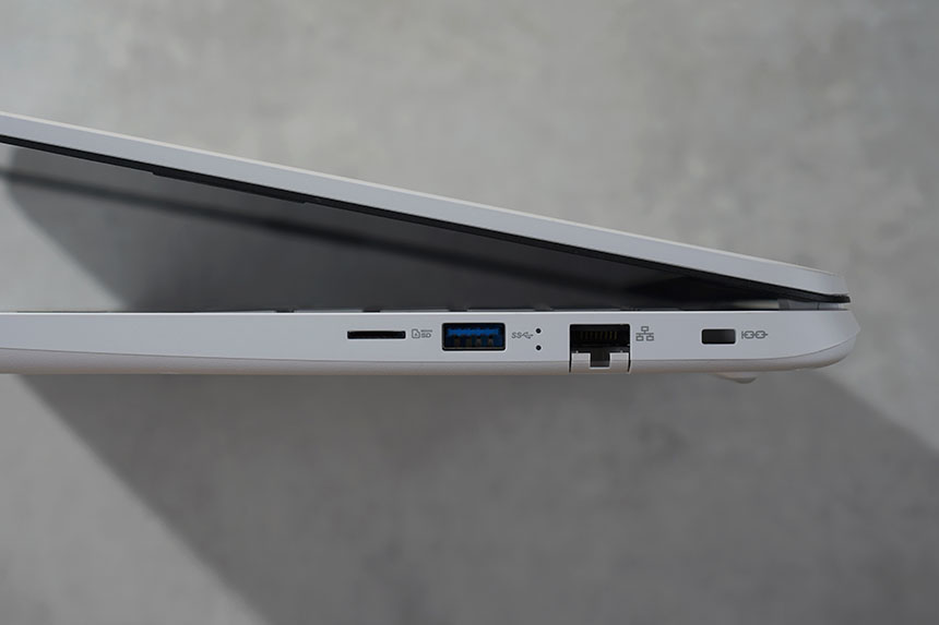 반대쪽 옆면에는 마이크로SD 카드 슬롯과 USB 3.0 타입A 포트 그리고 유선랜과 켄싱턴락 홀이 배치되어 있습니다. 확장성은 준수한 수준이라고 판단되었습니다.