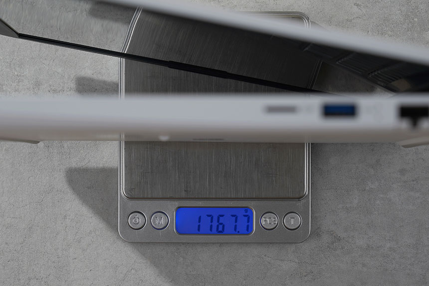 LG전자 2021 울트라PC 15UD50P-GX30K의 무게는 약 1.76kg으로 측정되었습니다. 15.6인치 크기의 디스플레이를 탑재했다는 점을 생각하면 휴대하는데 크게 부담스러운 수준은 아니라고 판단되었습니다.