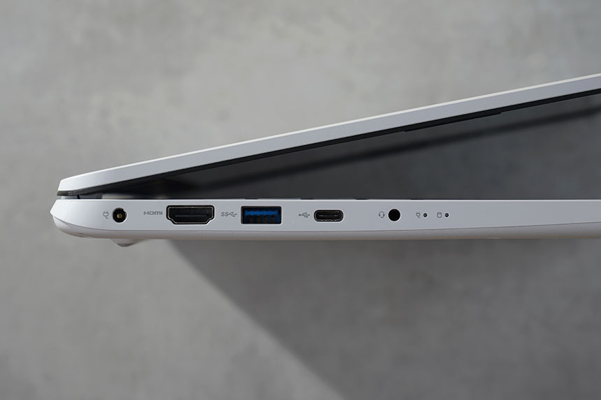 LG전자 2021 울트라PC 15UD50P-GX30K의 입출력 포트를 살펴보면 왼쪽에는 전원 잭과 HDMI 포트 그리고 USB 3.0 타입A, USB 3.1 타입C, 오디오 콤보 단자가 배치되어 있습니다.