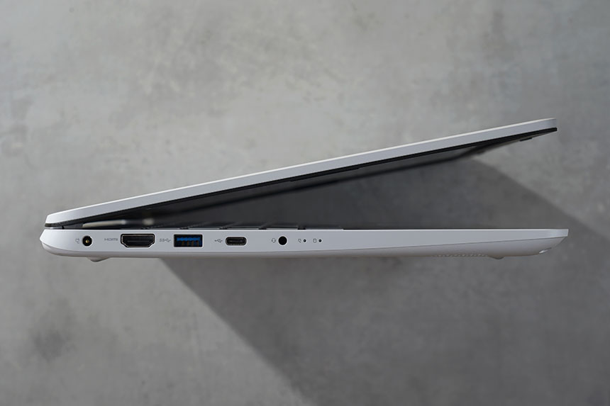 LG전자 2021 울트라PC 15UD50P-GX30K의 입출력 포트를 살펴보면 왼쪽에는 전원 잭과 HDMI 포트 그리고 USB 3.0 타입A, USB 3.1 타입C, 오디오 콤보 단자가 배치되어 있습니다.