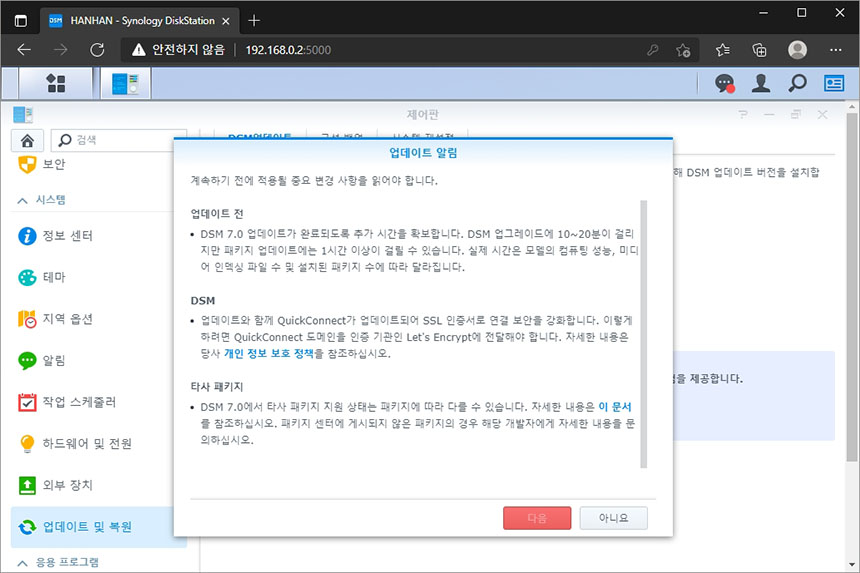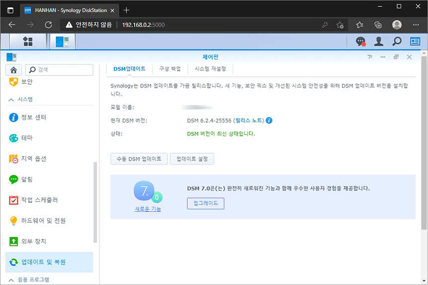 우선 자신이 사용하고 시놀로지 NAS의 관리자 페이지에 접속한 후에 제어판을 확인해 보면 업데이트 및 복원 항목에 DSM 7.0 업그레이드 기능이 활성화되어 있는 것을 확인할 수 있습니다.