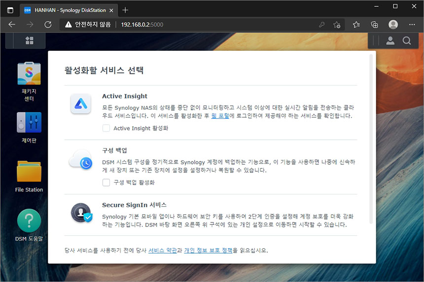 그리고 시작 단계에서 Active Insight와 구성 백업 그리고 Secure SignIn 서비스를 활성화할 것인지를 물어보는 메시지가 표시됩니다. 필요에 따라서 활용해 주는 것이 좋을 것 같습니다.