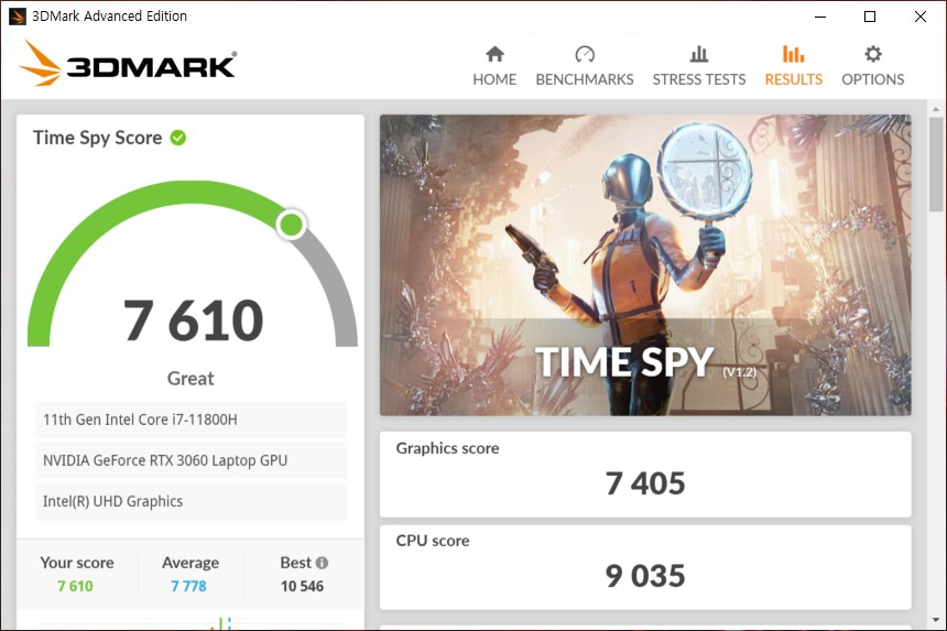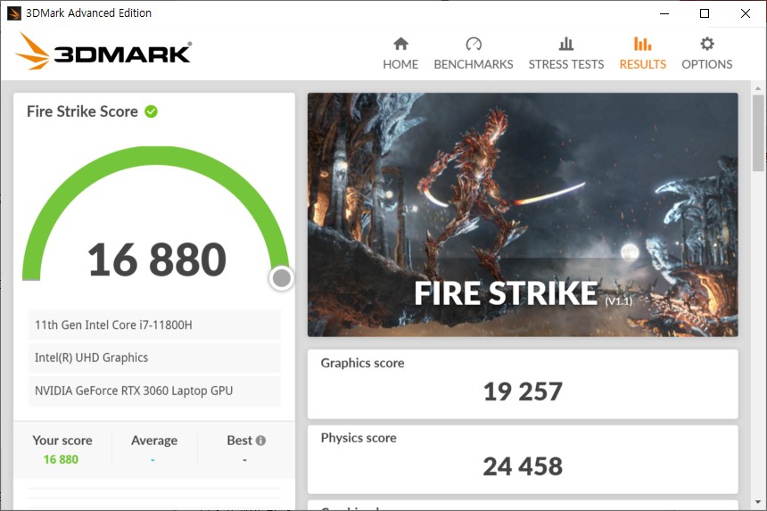 3DMARK를 통해서 엔비디아 지포스 RTX 3060 그래픽카드의 성능을 살펴보면 파이어 스트라이크는 16.880점(그래픽 스코어 19,257점), 타임 스파이는 7,610점(7,405점)으로 측정되었습니다.
