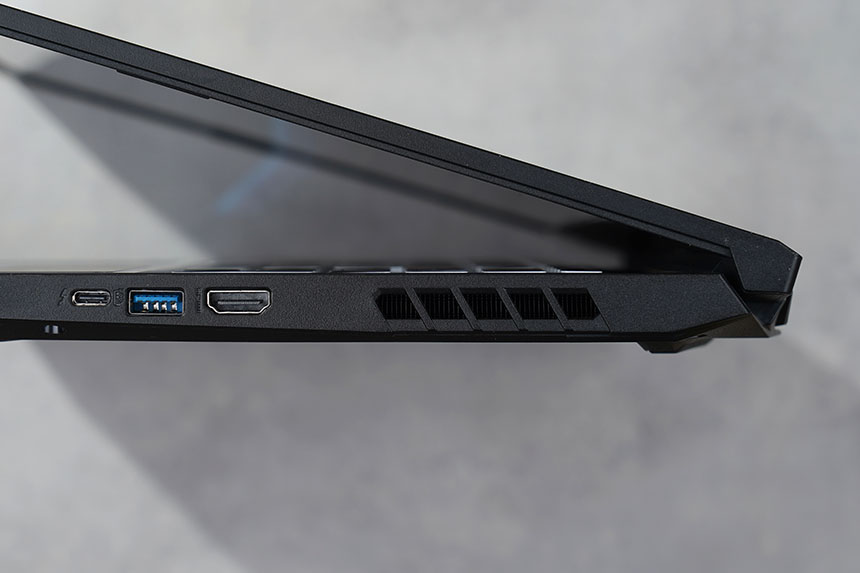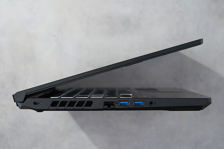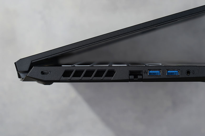 에이서 니트로 5 AN515-57 3060 MAX의 입출력 단자를 살펴보면 왼쪽에는 기가비트 유선랜 포트와 USB 3.2 Gen1 타입 A 단자 2개 그리고 헤드폰, 스피커 잭이 배치되어 있습니다.