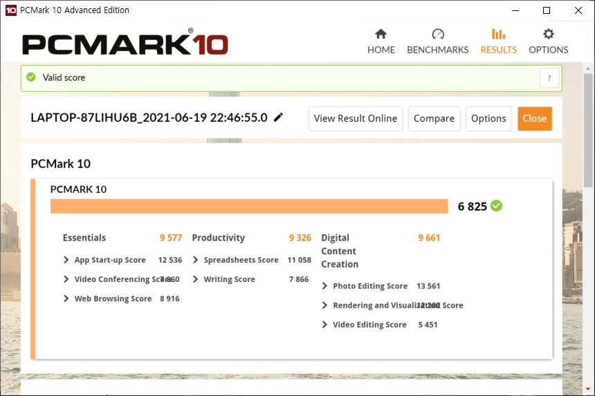 마지막으로 노트북의 전반적인 성능을 평가해주는 PCMARK10의 점수는 6,825점으로 측정되었습니다. 에이서 니트로 5 AN515-57 3060 MAX는 상당히 뛰어난 성능을 제공하는 제품이라고 할 수 있습니다.