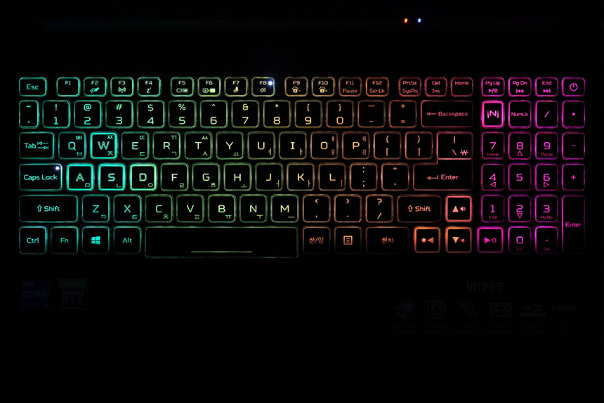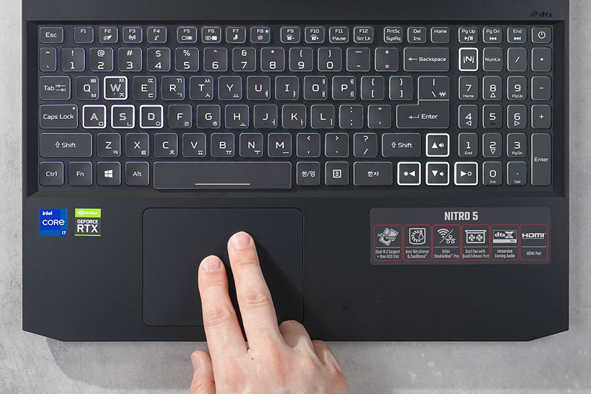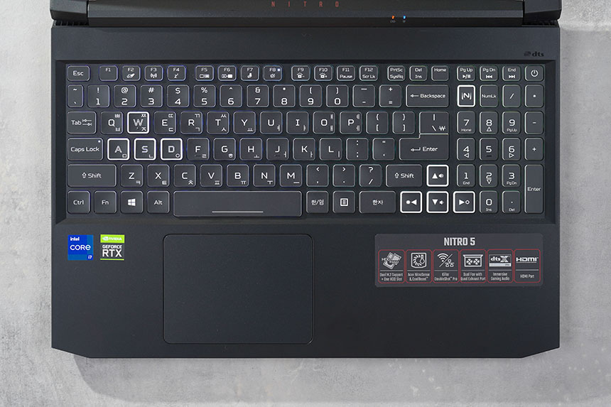 에이서 니트로 5 AN515-57 3060 MAX에는 한글 103키 키보드가 탑재되었습니다. 특히 숫자 키패드를 포함하고 있어서 게임은 물론이고 각종 문서 작업 용도로도 활용할 수 있습니다.