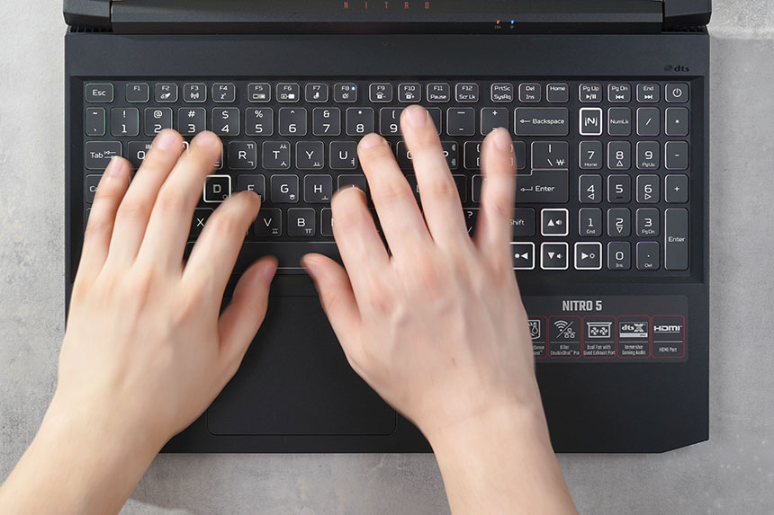 에이서 니트로 5 AN515-57 3060 MAX의 키보드 키감은 상당히 경쾌한 편입니다. 그래서 장시간 게임을 플레이하거나 문서 작업을 해도 크게 피로할 것 같지는 않습니다.