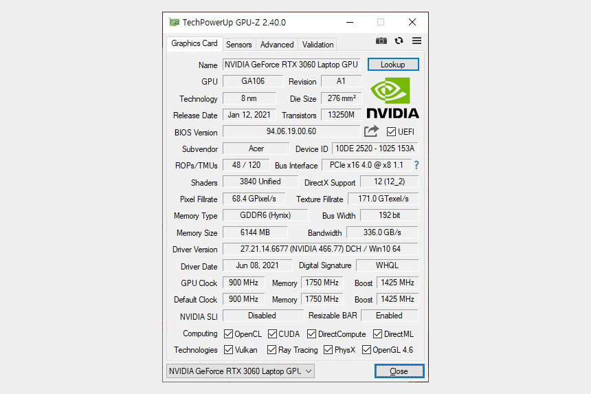 에이서 니트로 5 AN515-57 3060 MAX에는 엔비디아 지포스 RTX 3060 그래픽카드가 탑재되었습니다. 그래서 DLSS AI와 레이 트레이싱을 지원하는 최신 게임들도 플레이할 수 있습니다.