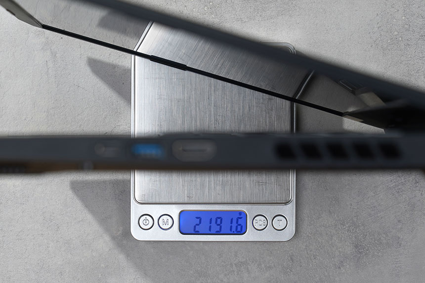 에이서 니트로 5 AN515-57 3060 MAX의 무게는 약 2.19kg으로 측정되었습니다. 외장 그래픽카드를 탑재한 제품이기 때문에 슬림 노트북과 비교하면 약간 묵직한 느낌을 주는 편입니다.