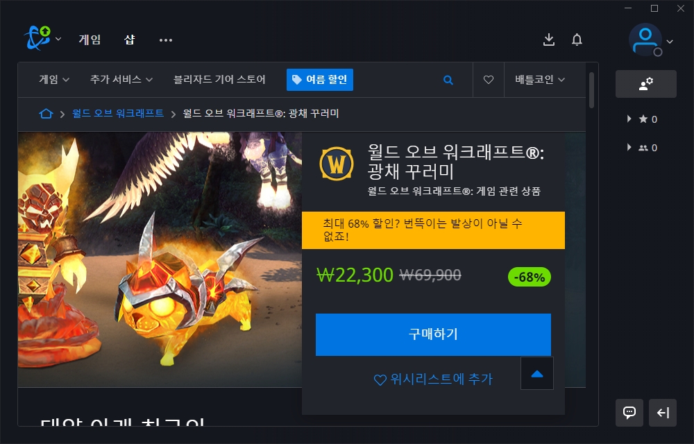 이번 여름 세일에서는 월드 오브 워크래프트 관련 아이템들이 많은 편입니다. 광채 꾸러미나 각종 탈것의 할인이 진행되고 있으니 와우를 플레이하는 분들이라면 한 번 구매해보시길 바랍니다.