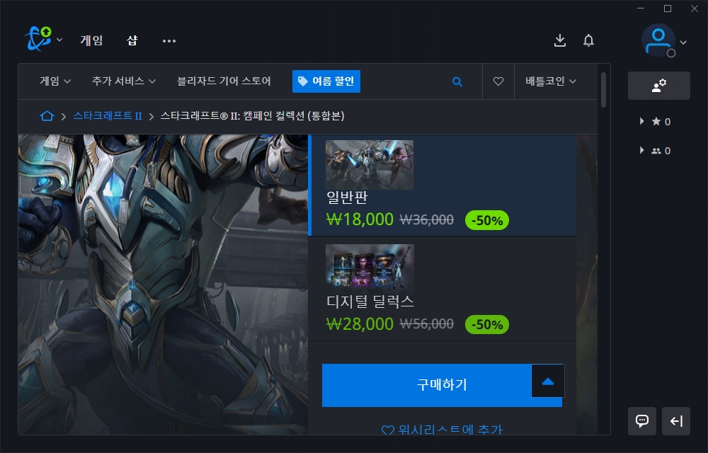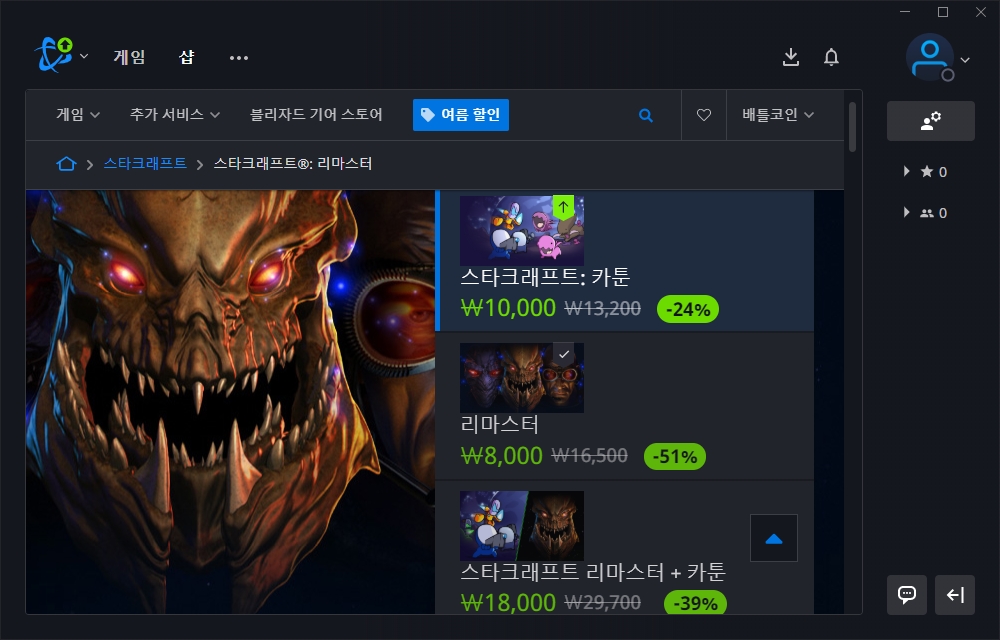 우선 국민 게임이라고 할 수 있는 스타크래프트1의 할인을 하고 있습니다. 카툰은 10,000원이고 리마스터는 8,000원 그리고 합본은 18,000원입니다. 올드 게이머라면 구매할 만한 가치가 있을 것으로 예상합니다.