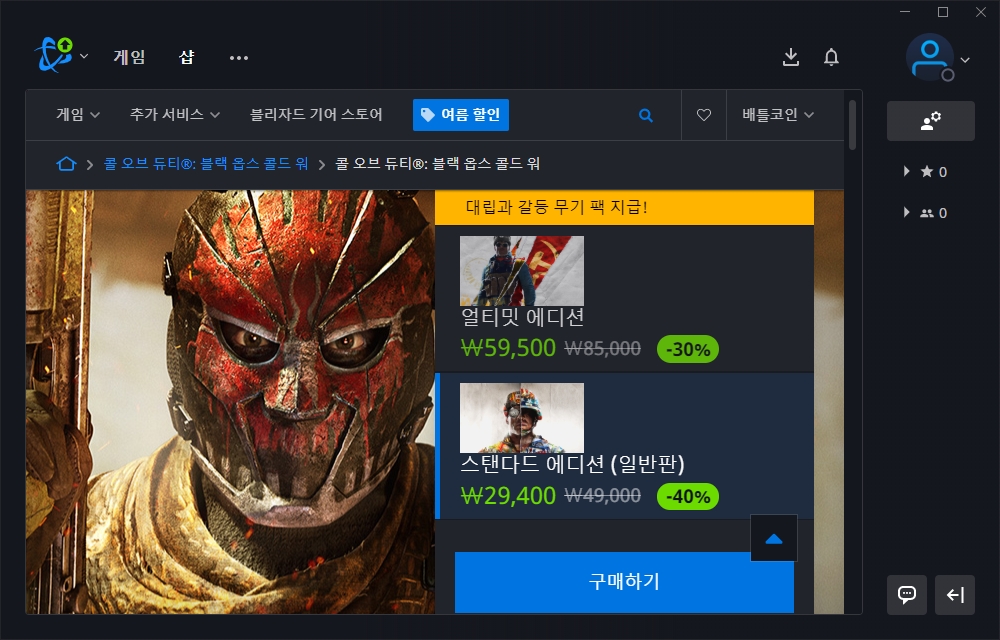 블리자드에서는 콜 오브 듀티 시리즈의 할인도 진행하고 있습니다. 우선 완성도 높은 게임이라는 평가를 받는 블랙 옵스 콜드 워의 스탠다드 에디션의 가격은 29,400원이고 얼티밋 에디션은 59,500원입니다. 얼티밋 에디션에서는 추가 스킨과 시즌1 배틀패스 등이 포함되어 있습니다.