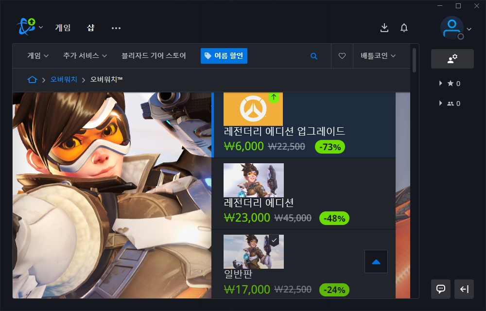 오버워치는 일반판은 17,000원 그리고 레전더리 에디션은 23,000원입니다. 레전더리 에디션에는 스킨이 몇 개 더 포함되어 있다고 합니다. 하이퍼 fps 게임 좋아하는 분들이라면 한 번 플레이해 보시길 바랍니다.