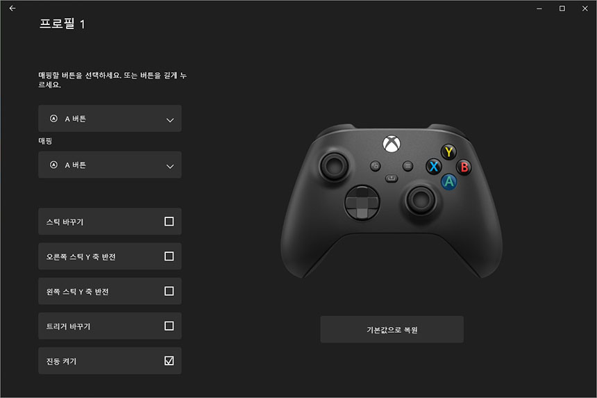 그리고 구성을 눌러서 새로운 프로필을 추가하면 자신이 원하는 버튼에 원하는 기능을 매핑할 수 있습니다. 저는 디폴트를 추천하지만, 사용자에 따라서 활용도를 높일 수 있는 부분입니다.