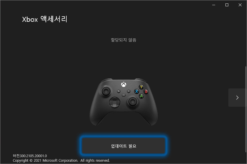 4세대 엑스박스 컨트롤러를 컴퓨터와 유선으로 연결하고 앱을 실행시키면 위와 같이 업데이트가 필요하다는 메시지가 표시됩니다. 인터넷 검색 결과 블루투스 연결성 관련 내용이 포함되어 있다는 루머가 있습니다.