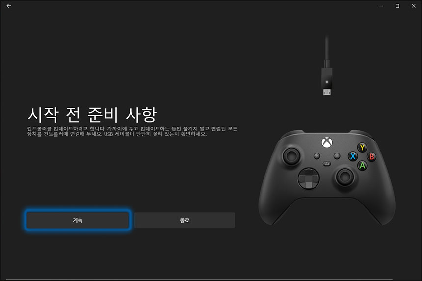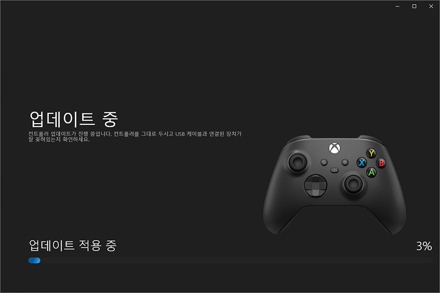 업데이트를 진행하면 길지 않은 시간이 지난 후에 완료가 됩니다. 그리고 주의할 점은 업데이트 중에는 4세대 엑스박스 컨트롤러와 컴퓨터의 유선 연결이 끊어지면 안된다는 점입니다.