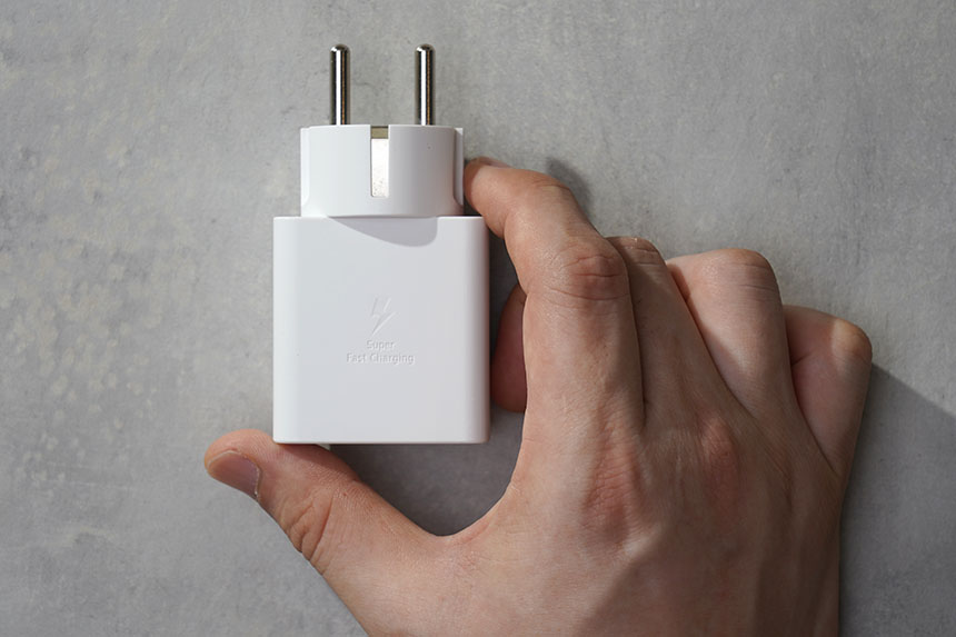 삼성 65W Gan 접지 충전기의 전면에는 Super Fast Charging이라는 문구가 각인되어 있습니다. 그래서 삼성전자의 플래그십 스마트폰을 연결하면 초고속 충전 기능이 활성화됩니다.