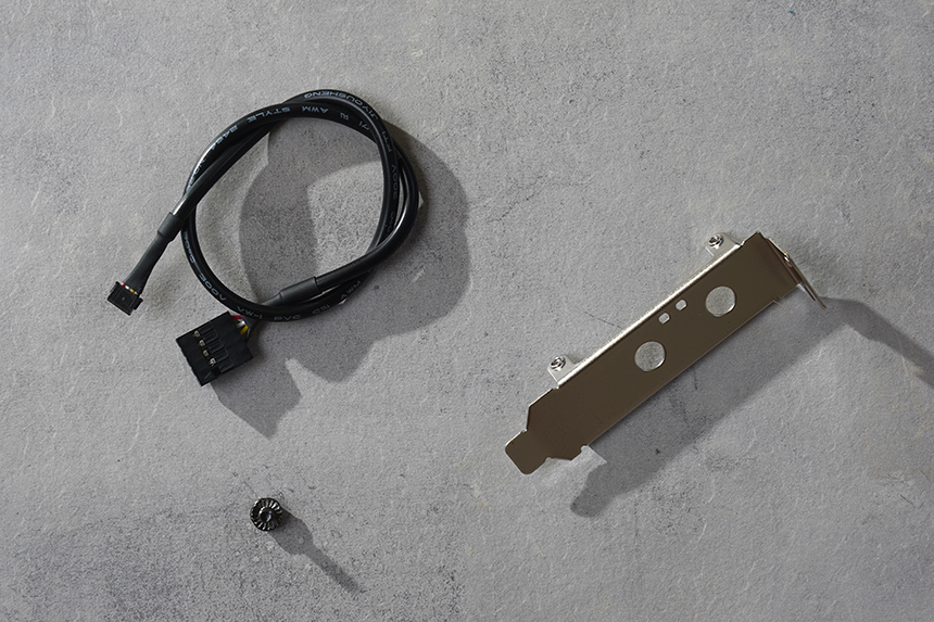 다른 액세서리를 살펴보면 LP 타입의 케이스에 장착할 수 있는 브라켓과 블루투스 케이블이 별도로 포함되어 있습니다. 참고로 블루투스 기능을 활용하기 위해서는 메인보드의 USB 포트에 케이블을 장착해 주어야 합니다.