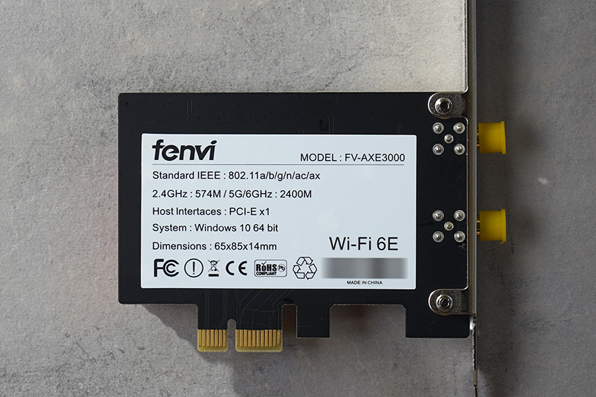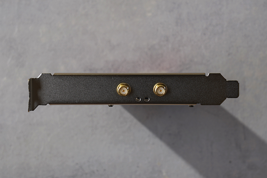 Fenvi FV-AXE3000 무선랜카드의 옆쪽을 살펴보면 두 개의 안테나 커넥터가 배치되어 있습니다. 바로 안테나를 장착해서 사용해도 되고 동봉된 안테나 확장 스테이션을 활용해도 주어도 좋을 것 같습니다.