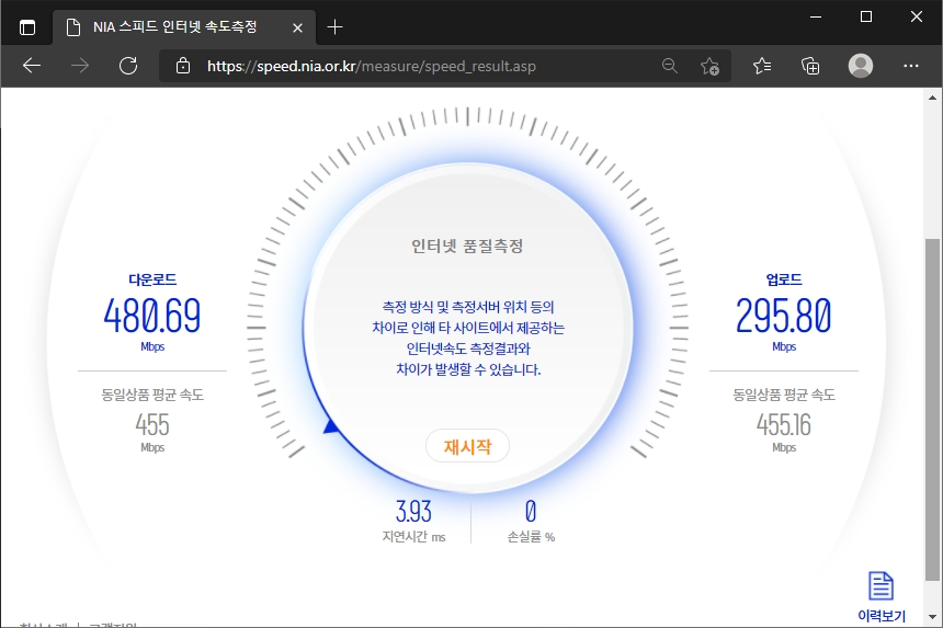 무선 인터넷 속도를 살펴보면 다운로드는 KT 기가인터넷 500M 기준으로 유선랜과 크게 차이가 없는 수준이라는 것을 확인할 수 있습니다. 이 정도라면 일상적으로 사용하기에 부족하지 않을 것 같습니다.