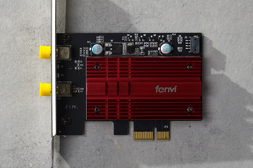 Fenvi FV-AXE3000 무선랜카드의 옆쪽을 살펴보면 두 개의 안테나 커넥터가 배치되어 있습니다. 바로 안테나를 장착해서 사용해도 되고 동봉된 안테나 확장 스테이션을 활용해도 주어도 좋을 것 같습니다.