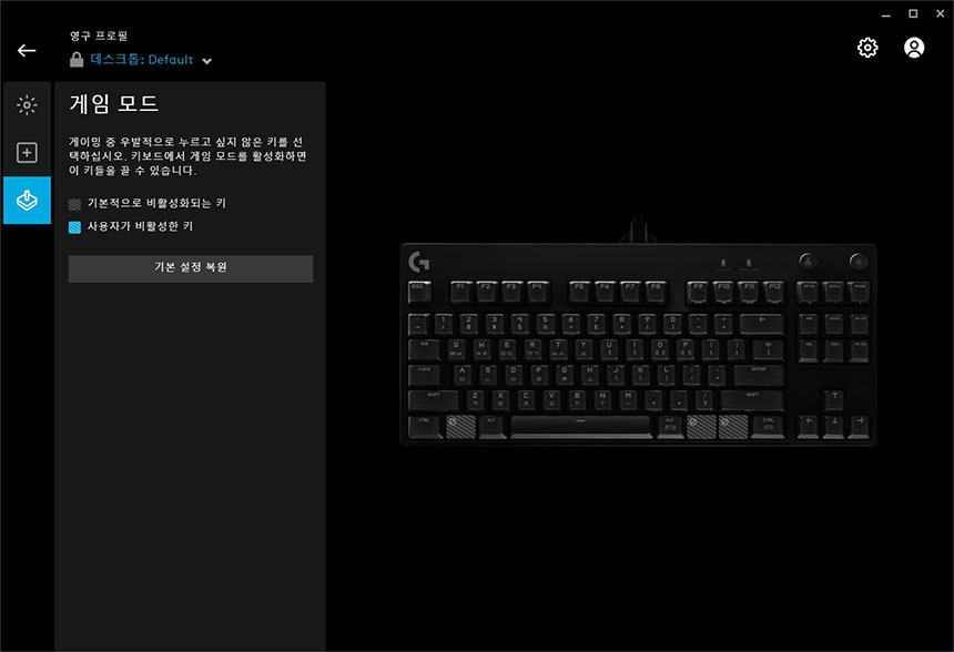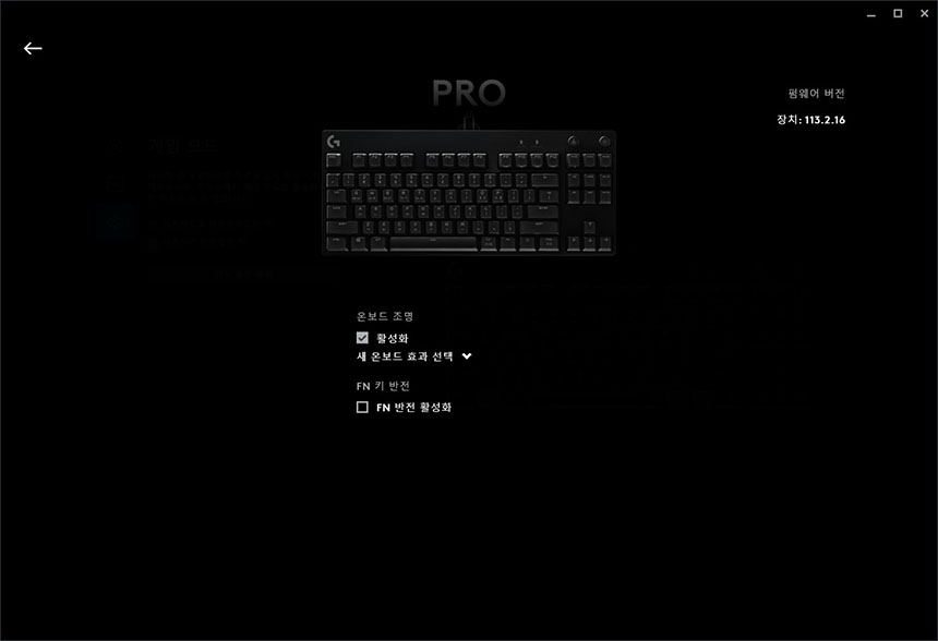 설정에서는 로지텍 G PRO X 게이밍 키보드의 온보드 조명 효과를 활성화하거나 일부 노트북처럼 FN 키 반전 기능도 지원하고 있습니다. 필요에 따라서 활용해주는 것이 좋을 것 같습니다.