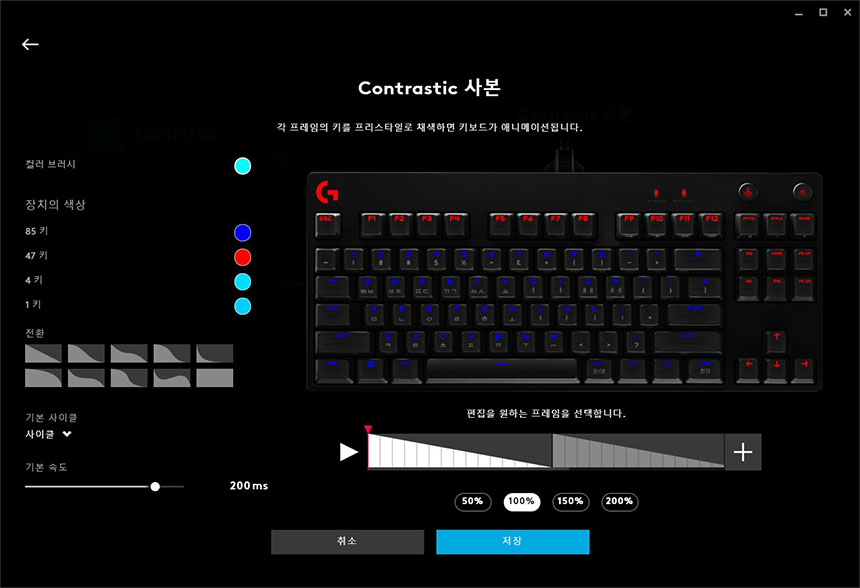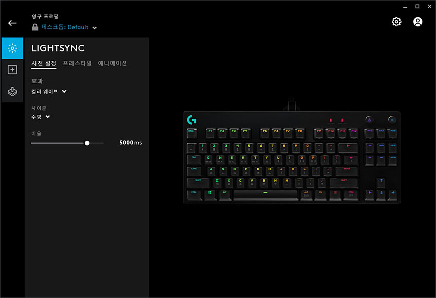 로지텍 G HUB의 메뉴는 3개로 구성되어 있습니다. 우선 LIGHTSYNC에서는 RGB 조명의 효과나 사이클 그리고 비율을 변경할 수 있습니다. 다양한 프리셋이 제공되기 때문에 자신의 기분에 따라서 설정할 수 있습니다.