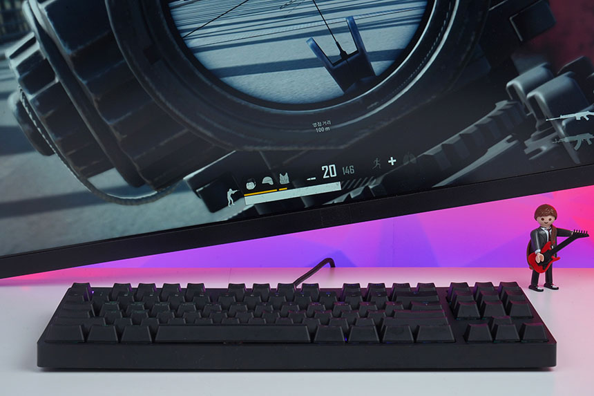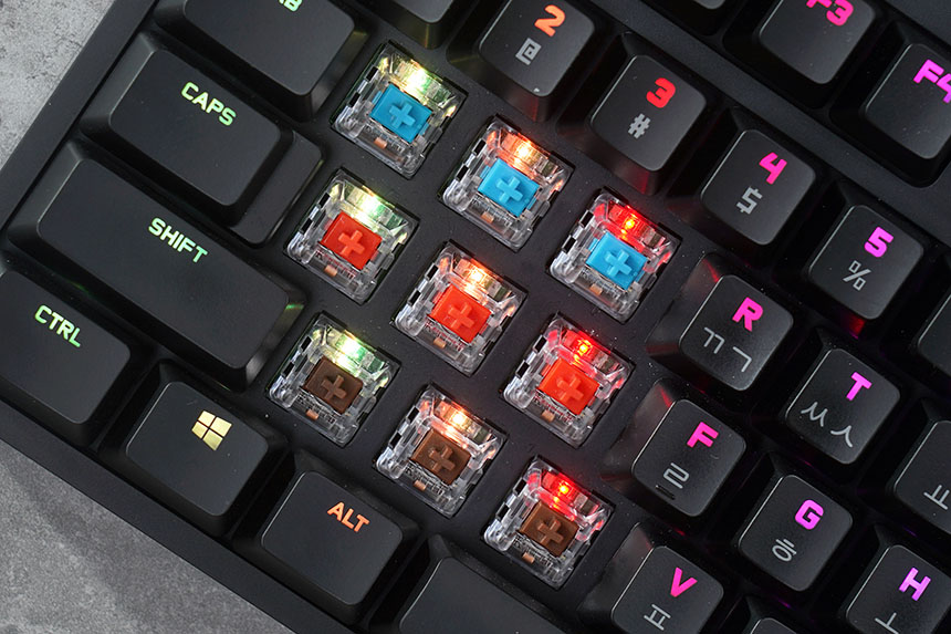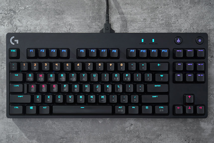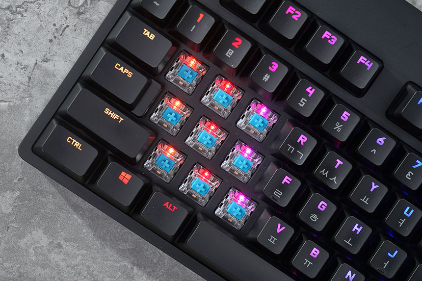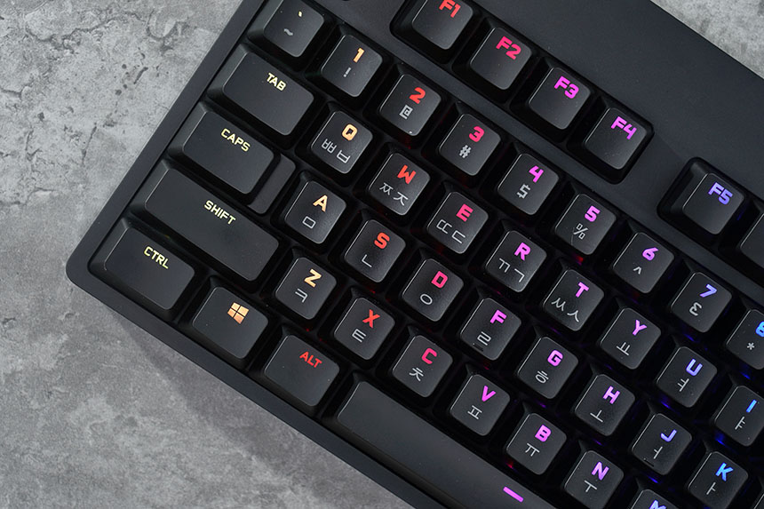 키캡을 자세하게 살펴보면 LIGHTSYNC RGB 조명이 또렷하게 투과되는 것을 확인할 수 있습니다. 그래서 낮에도 명확하게 잘 보이는 편입니다. 그리고 한국어 각인도 깔끔하다고 생각되었습니다.