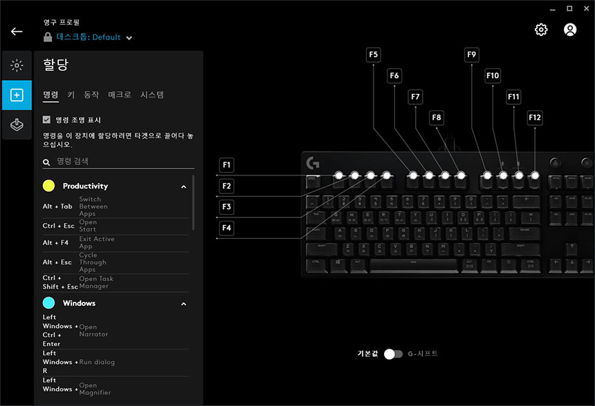 할당에서는 로지텍 G PRO X 게이밍 키보드의 펑션키 부분에 자신이 원하는 기능을 지정할 수 있습니다. 상당히 강력한 기능 중의 하나이고 게임은 물론이고 작업용으로도 유용합니다.